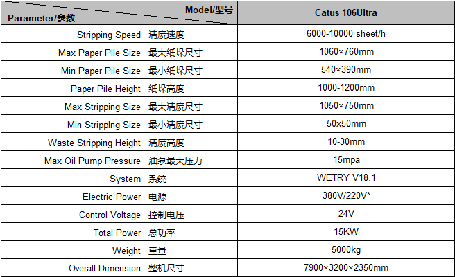 1. Catus 106Ultra adopts the original invention patent technology (Patent No.: 2024115145971) and is equipped with a powerful mold-free full-sheet waste stripping function. It enables the entire continuous operation process, including automatic paper feeding, automatic alignment, automatic waste stripping, as well as automatic palletizing of finished products and synchronous automatic removal of waste materials after waste stripping, significantly reducing the need for manual intervention.