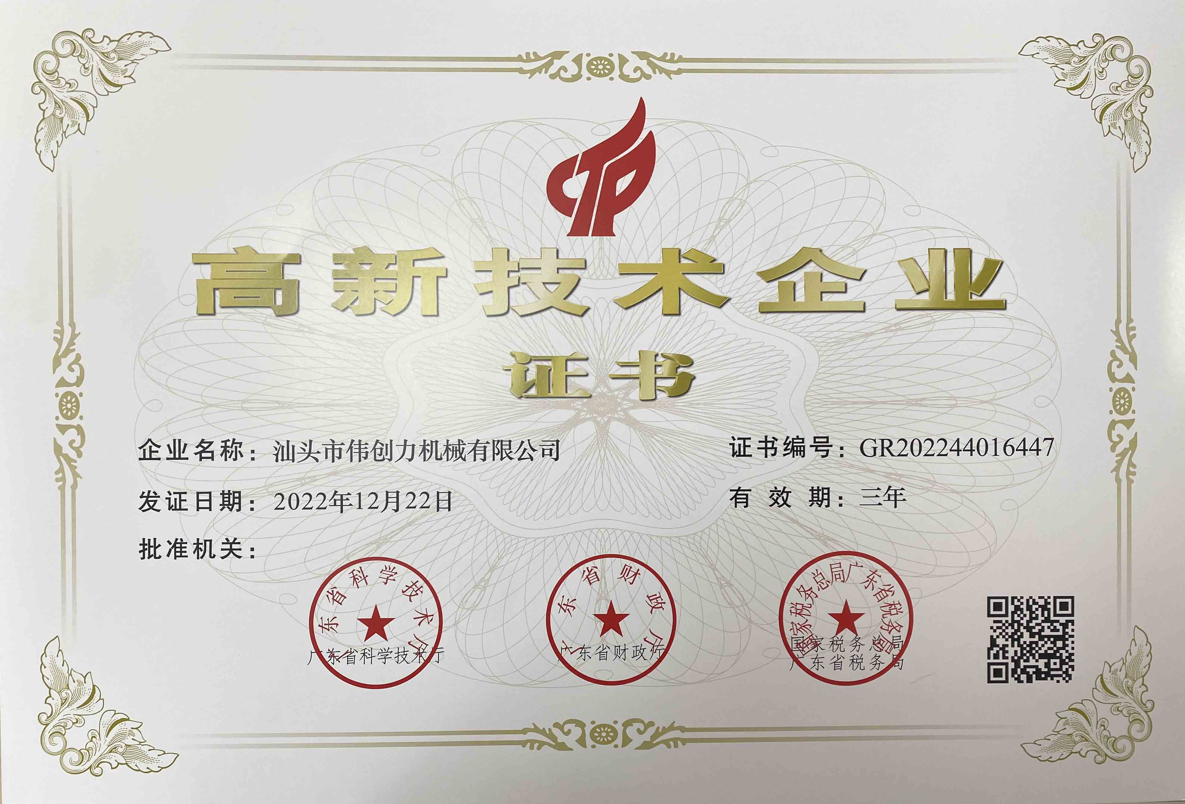 春光作序,萬(wàn)象更新,汕頭市偉創(chuàng)力機(jī)械有限公司喜獲佳音。憑借專業(yè)的研發(fā)團(tuán)隊(duì)、雄厚的技術(shù)實(shí)力、持續(xù)的創(chuàng)新能力、科學(xué)的企業(yè)管理,經(jīng)全國(guó)高新技術(shù)企業(yè)認(rèn)定管理工作組織的嚴(yán)格審查,我司順利通過(guò)了高新技術(shù)企業(yè)認(rèn)定,成功獲得"高新技術(shù)企業(yè)證書(shū)",由此正式邁入國(guó)家高新技術(shù)企業(yè)行列,可喜可賀!