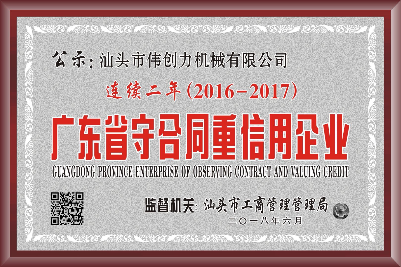 2018年汕頭市偉創(chuàng)力機械有限公司連續(xù)二年被評為"守合同重信用企業(yè)"